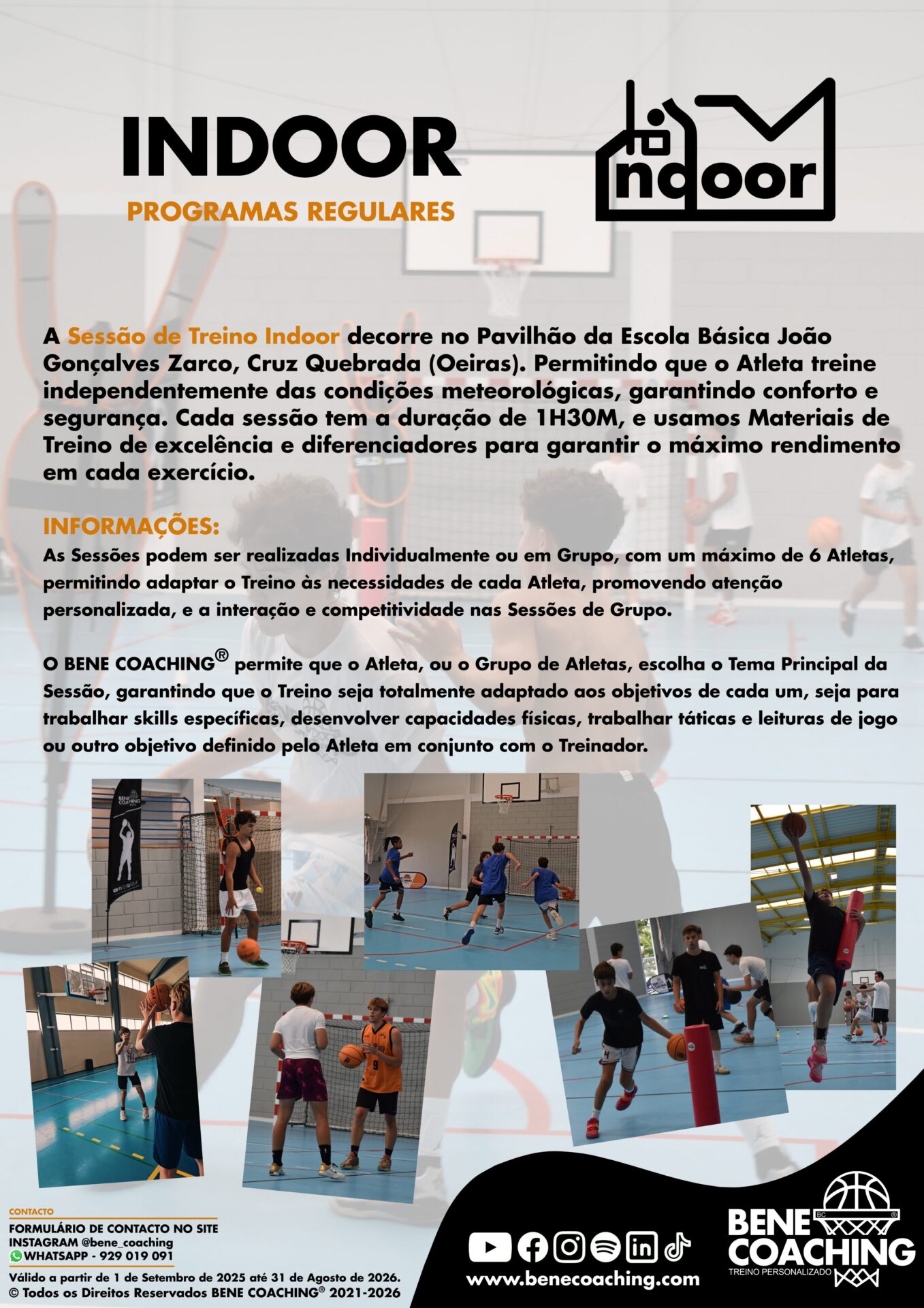 A Sessão de Treino Indoor realiza-se no Pavilhão da Escola Básica João Gonçalves Zarco, Cruz Quebrada (Oeiras). Tem a duração de 1H30M e pode ser realizada individualmente ou em grupo (2 a 6 Atletas). Neste Treino há maior disponibilidade de Material de Treino.