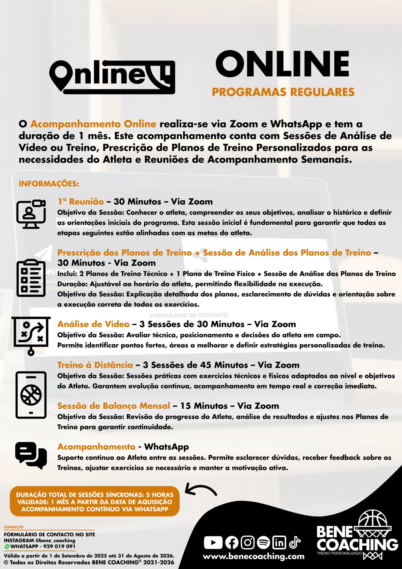 O Acompanhamento Online realiza-se via Zoom e tem a duração de 1 mês. Este acompanhamento conta com Sessões de Análise de Vídeo, Prescrição de Planos de Treino Personalizados para as necessidades do Atleta e Reuniões de Acompanhamento semanais.