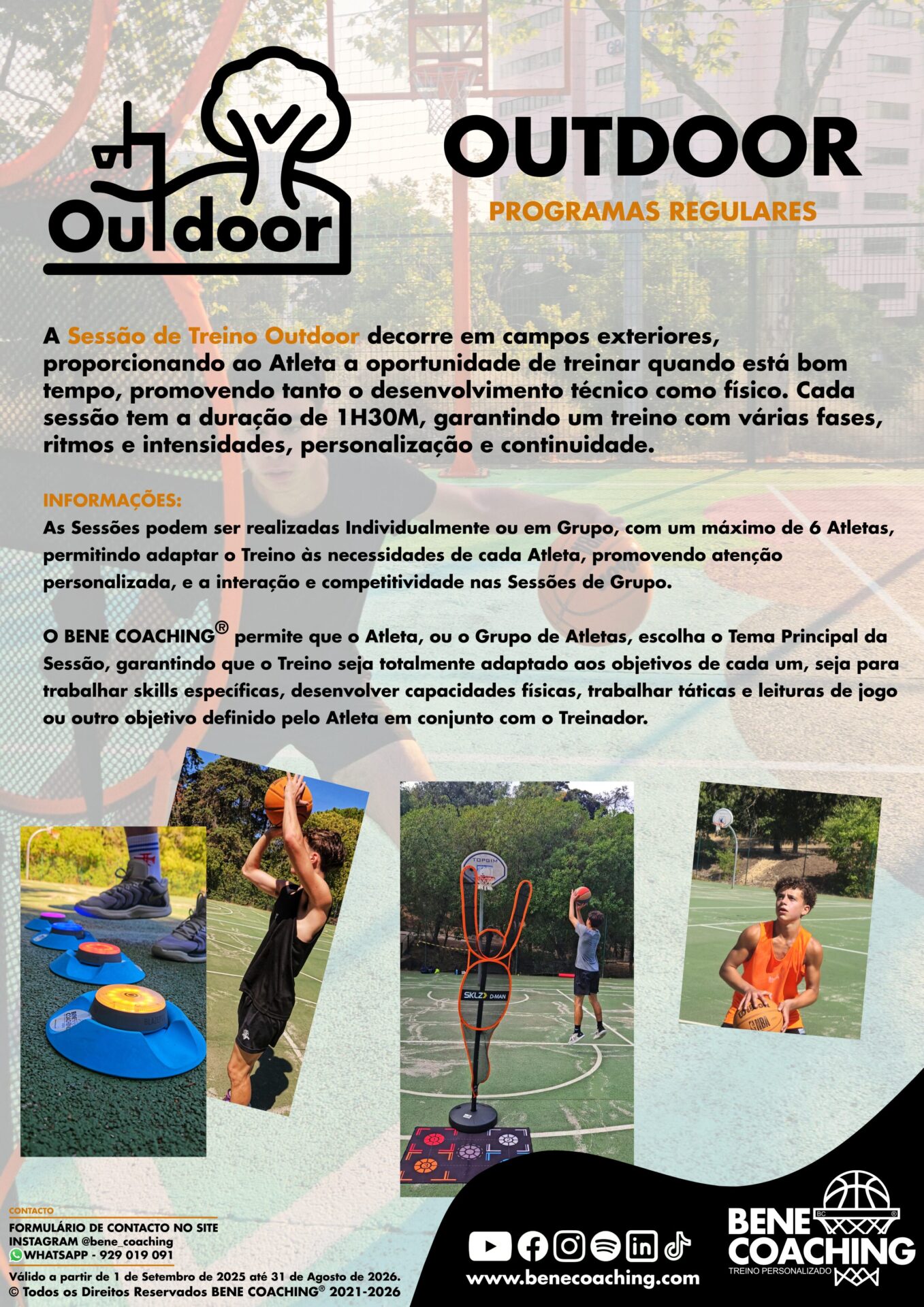 A Sessão de Treino Outdoor realiza-se em campos exteriores, tem a duração de 1H30M e pode ser realizada individualmente ou em grupo (2 a 6 Atletas). É o Atleta que escolhe o Tema Principal da Sessão de Treino.